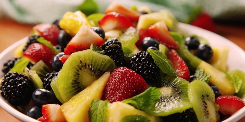 1. Pelar las frutas, cortarlas en pedacitos y añadirles el zumo de limón.